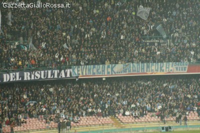 Ennesima pessima figura da (presunti) tifosi notata ieri allo stadio San Paolo durante il match di Europa League tra Napoli e Porto. Sugli spalti è apparso un lungo striscione, difficile da non notare, che recitava testualmente: “Kevin-crack…godo ancora!“. Un riferimento spiacevole e assolutamente anti-sportivo verso il terribile infortunio subito da Kevin Strootman, l’olandese della Roma che proprio contro gli azzurri ha rimediato due settimane fa la lesione dei legamenti del crociato.