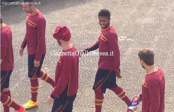 Ore 15.05 La squadra comincia a scendere in campo. Totti comanda il gruppo. Sono out Balzaretti e Strootman, Maicon è in campo.