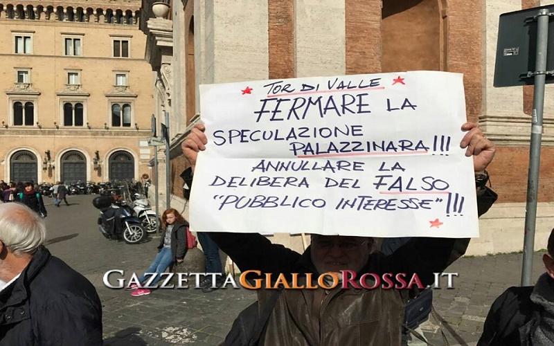 Diversi i cori intonati dai presenti, tra cui: “Stadio sì, ma non così”. Esposti anche alcuni striscioni che recitano: “Tor di valle: fermare la speculazione palazzinara e annullare la delibera del falso ‘pubblico interesse’!”, “M5s 2016: zero consumo suolo. M5S 2017: ???” e “Coraggio, annulliamo la delibera Marino”.