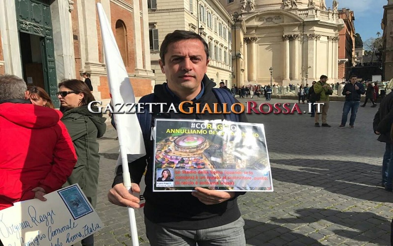 Sit in di protesta contro la cementificazione della zona di Tor Di Valle. In questi minuti alcuni attivisti del M5S si trovano davanti la chiesa Madonna di Loreto ed a breve raggiungeranno il Campidoglio per esprimere il loro dissenso verso la costruzione dello Stadio della Roma.