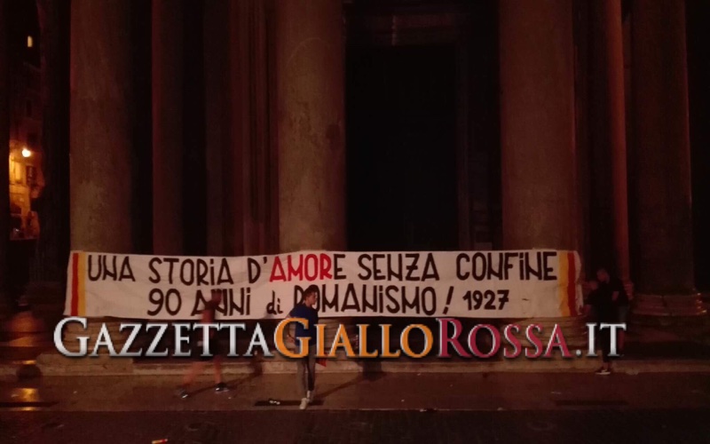 Quasi 2000 tifosi giallorossi si sono dati appuntamento in Piazza del Pantheon per poi spostarsi in via degli Uffici del Vicario 35, prima sede dell’AS Roma, per festeggiare allo scoccare della mezzanotte i 90 anni del club. Cori, fumogeni e striscioni.