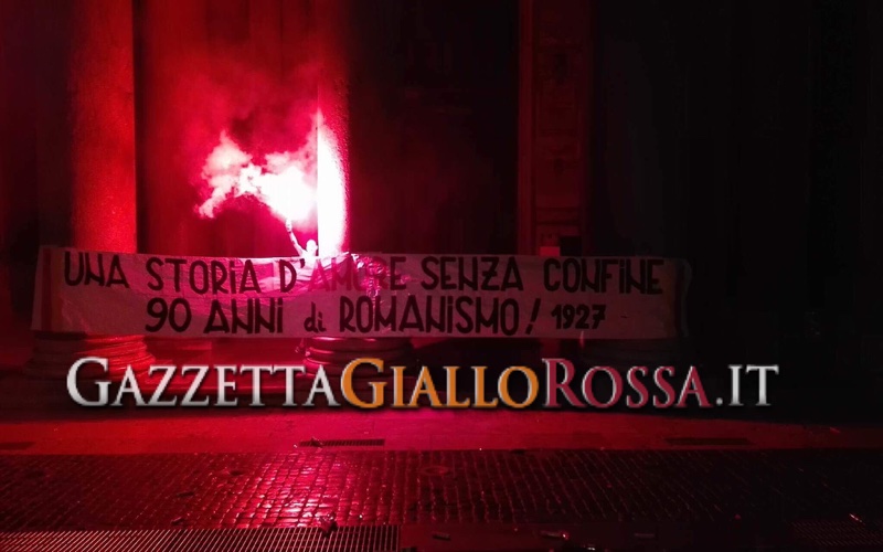 “Una storia d’amore senza confine…90 anni di Romanismo! 1927”, lo striscione esposto dai tifosi romanisti.
