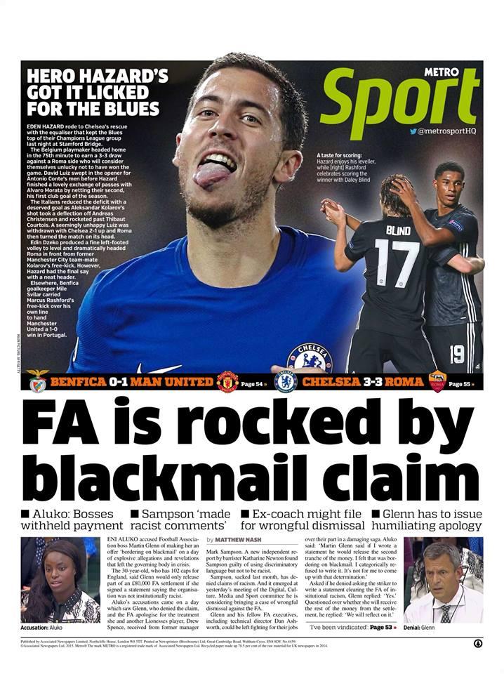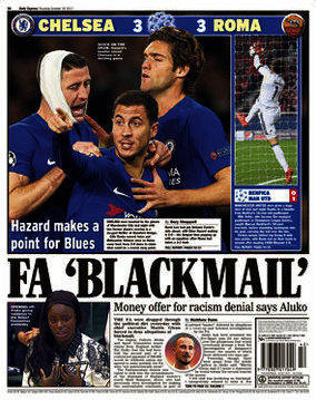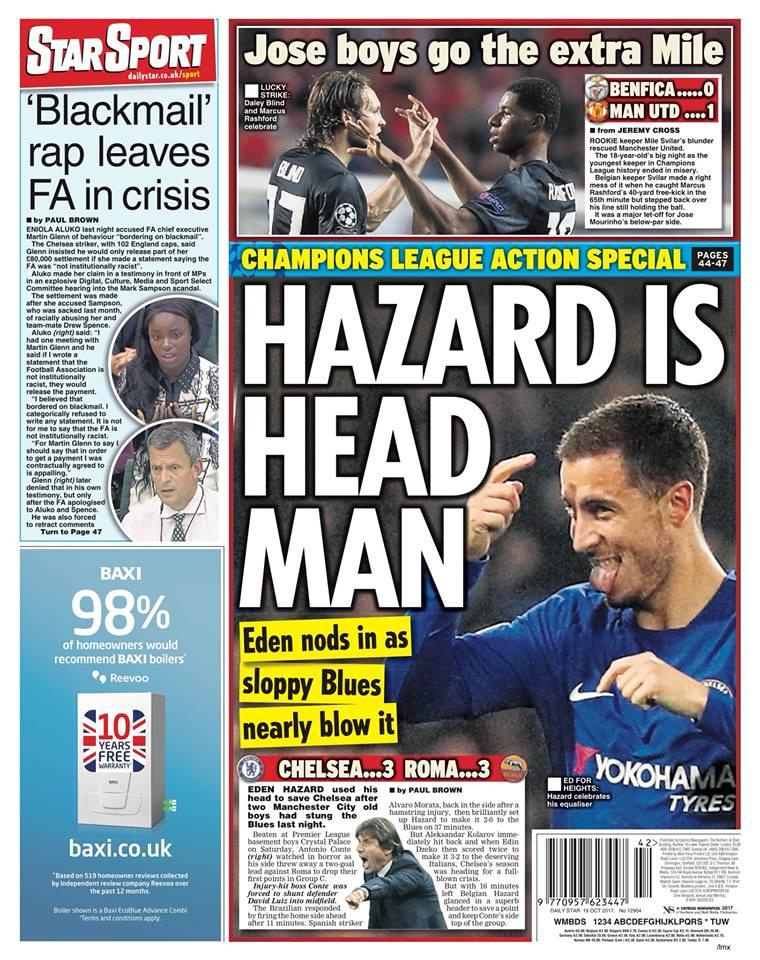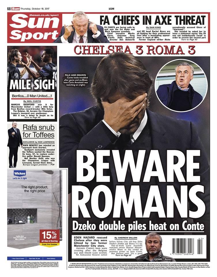 In terra inglese tutti vedono il 3-3 di ieri come una sconfitta e le colpe cadono tutte addosso ad Antonio Conte: “Attenti ai romani” è il titolo in prima pagina del The Sun Sport, che mostra proprio il tecnico italiano in un frame malinconico. Il Times, invece, ‘ringrazia’ Eden Hazard per aver “riparato le crepe della difesa del Chelsea contro la Roma“. Anche il Telegraph non risparmia la raffica di attacchi ai Blues definendo la prova difensiva “catastrofica” (“I campanelli d’allarme squillano in mezzo al caos in aumento“) e sottolineando come Hazard abbia “salvato i suoi tornando al gol in Champions dopo 33 mesi, evitando così la terza sconfitta consecutiva“. Il Daily Mail ha ironizzato nei confronti di Antonio Conte, ‘usando’ i due protagonisti giallorossi Dzeko e Kolarov (entrambi ex del City): “Conte deve essere malato del Man City, dopo la sconfitta in campionato, due giocatori ex Citizens hanno ‘strapazzato” i Blues“. “Hazard salva i nervi di Conte“, titola il Daily Express, che sottolinea come: “Alla fine il tecnico sarà soddisfatto del punto guadagnato”. Il Star Sport in prima pagina mostra l’esultanza di Hazard che si indica la testa con la quale ha siglato il 3-3 finale.
