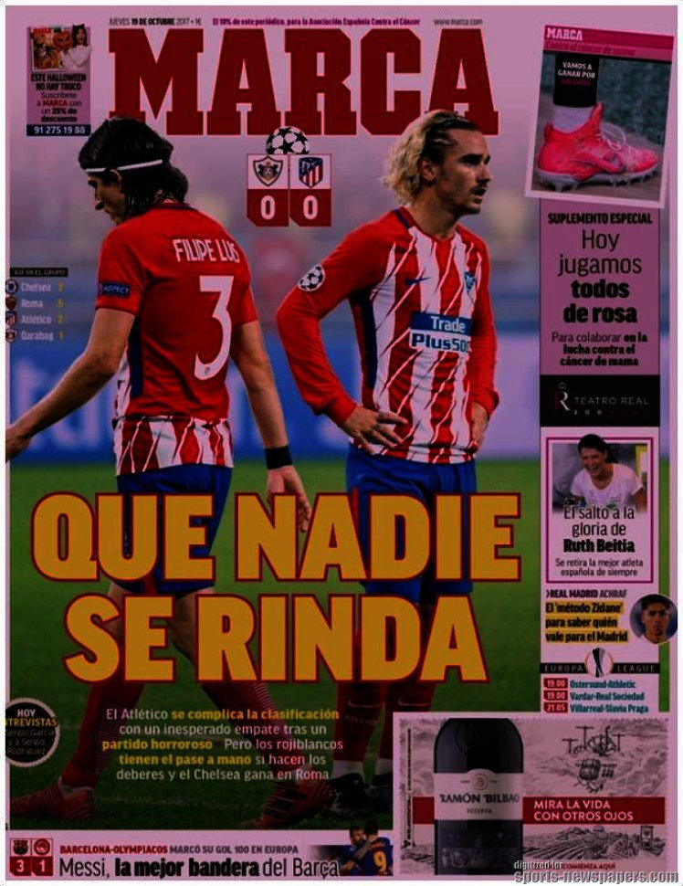 Anche in Spagna si parla del risultato di Londra e si dice come il pari, secondo il Mundo Deportivo, “mantenga in vita l’Atletico Madrid nella corsa agli ottavi“. Il quotidiano As evidenzia come “Chelsea, Roma e Atletico siano ancora tutte in fila per la qualificazione e che gli spagnoli dovranno dare il meglio nelle prossime gare“. Eden Hazard è il protagonista anche del pezzo di Marca, che esalta il belga per aver “contenuto i danni per il Chelsea e per l’Atletico“.